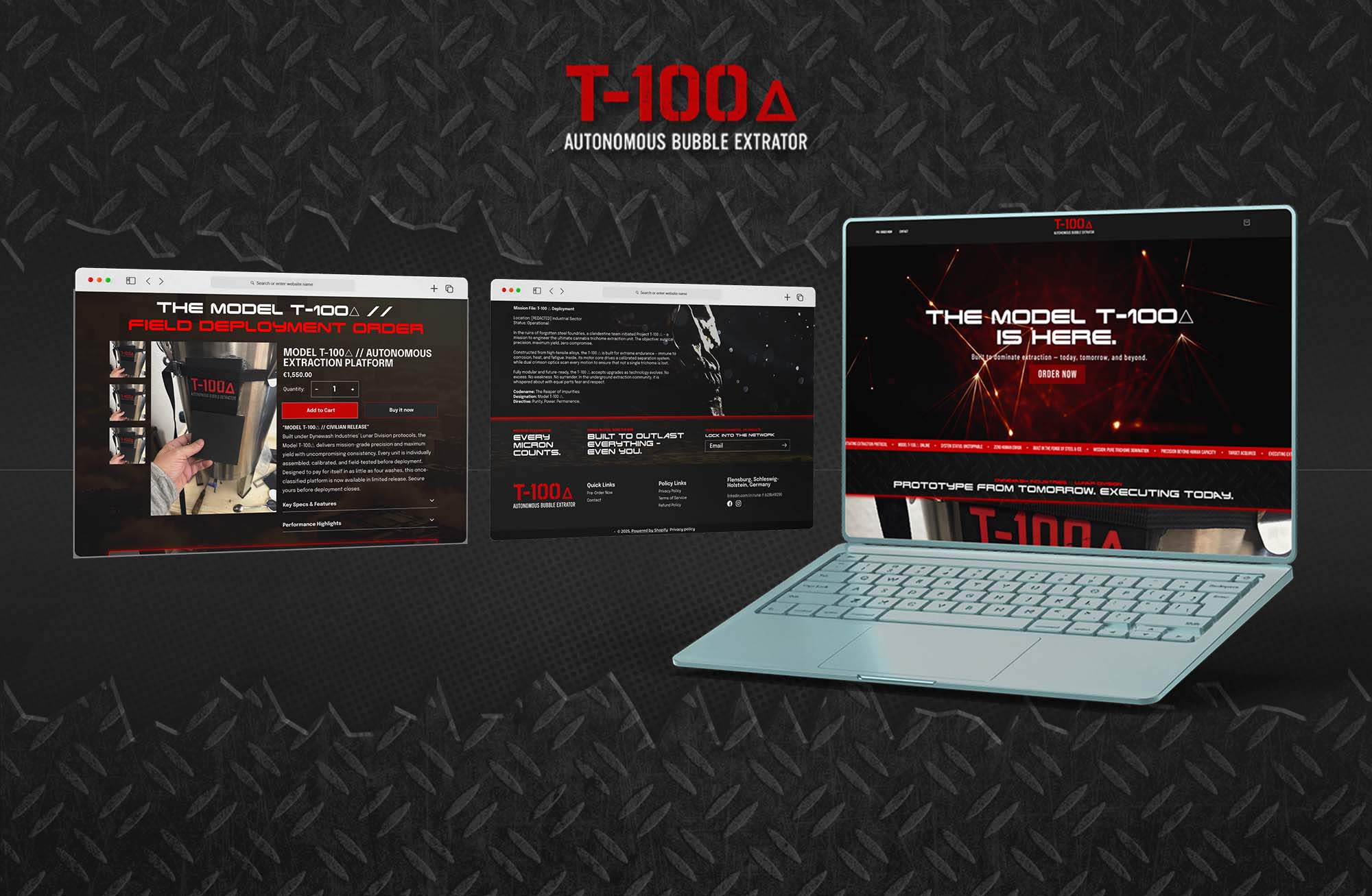 T-100 is a premium one-product Shopify store built to showcase the high-end cannabis trichome separator — the Model T-100 Δ. The brand combines industrial engineering with cinematic storytelling, giving the product a futuristic, Terminator-inspired identity.